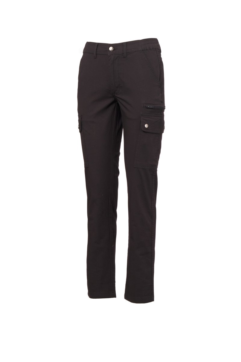 Damesbroek met klassieke snit van lichte ripstop stretchstof, met elastiek opzij en ceintuurlussen. Ritssluiting met metalen knoop, twee zakken voor in klassieke snit, twee zakken met klep opzij met kliksluiting, een zak met rits links, een uitvouwbare zak voor rolmaat rechts, twee steekzakken achter met knoop en knoopsgat.