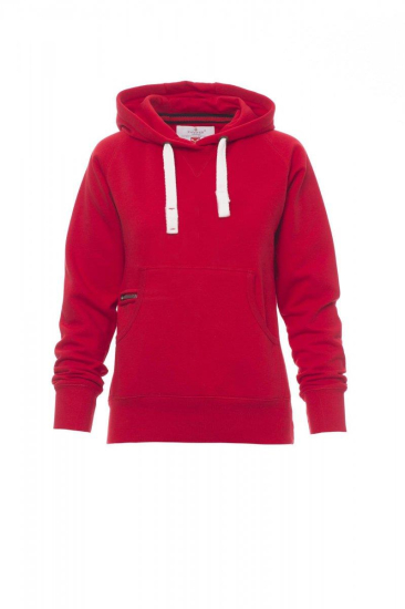Nauwsluitende dameshoodie met dubbel gestikte naden en wit trekkoord met contrasterend stiksel en metalen ringen, raglanmouwen, V-stiksel bij de hals, kangoeroezakken, kleine zak met rits, ribboorden met stretch aan de zoom en mouwen, versterkte naden.