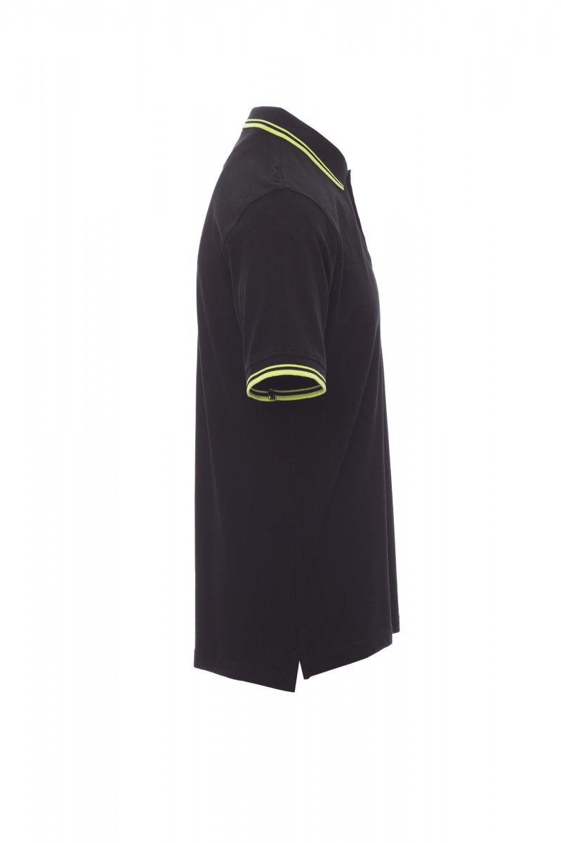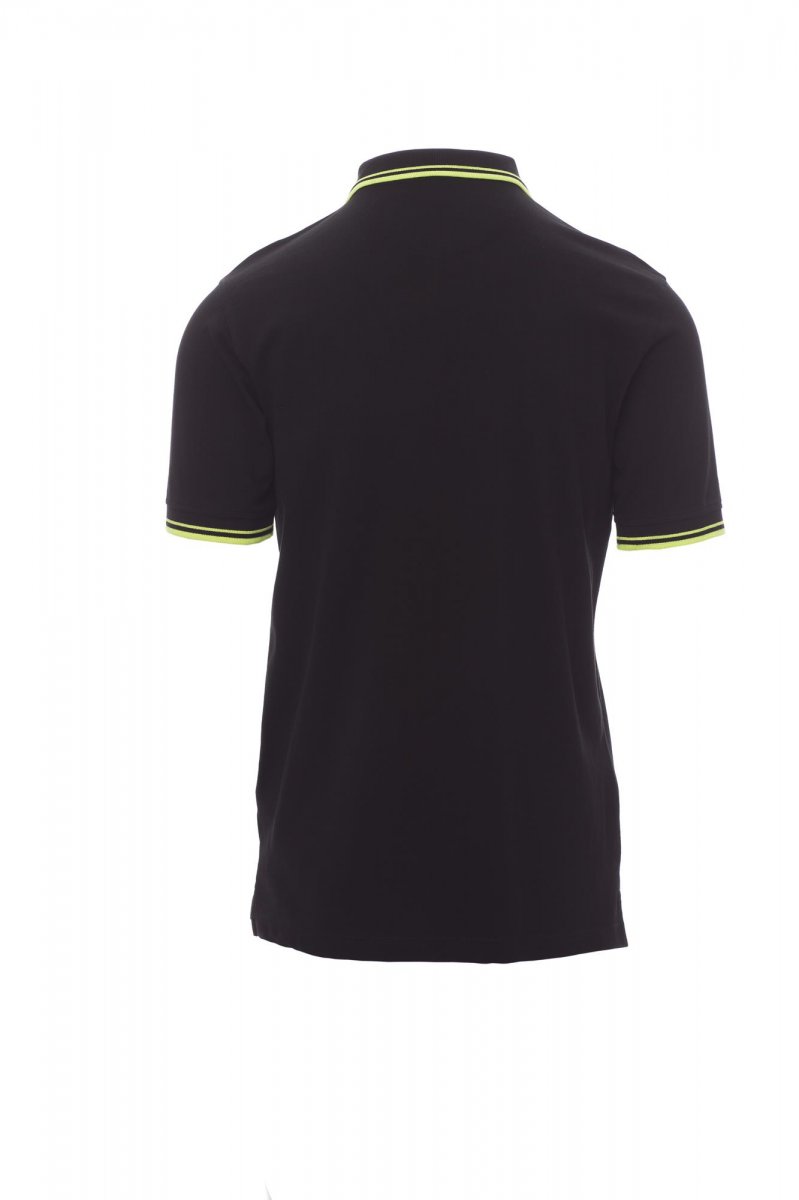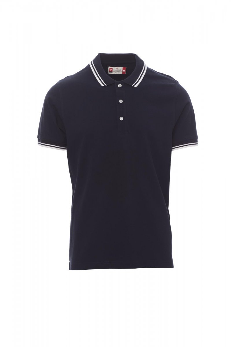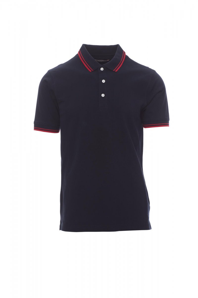 Herenpoloshirt met korte mouwen met 3 witte knopen, kraag en mouwen met fijne contrasterende strepen, ribkraag en geribde mouwboorden, zijsplitten met versterkte naden, verborgen stiksels bij de kraag, versterkingsband aan de zijkant, elastische naden, band aan de binnenzijde van de nek.