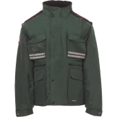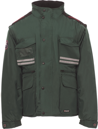 Herenjas met afneembare mouwen, kunststof rits van 8 mm met metalen runner met overslag en kunststof knopen, afneembare en/of uitvouwbare gevormde capuchon, verstelbare manchetten, grijze reflecterende banden aan de voor- en achterkant, voorgevormde ellebogen en zijsplit met inzetstuk en rits, negen buitenzakken waarvan twee met LOCK SYSTEM, twee met rits en verstevigde binnenzak, een met omkeerbare badgehouder. Binnenzijde: gewatteerd, binnenkraag, rug en onderrugverwarmer van microfleece, ademende inzetstukken onder de arm, trekkoord in de taille en rits aan binnenkant voor eenvoudiger bedrukken en borduren.