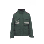 Damesjas met afneembare mouwen, comfort-fit, kunststof rits van 8 mm met metalen runner met overslag en kunststof knopen, afneembare en/of uitvouwbare gevormde capuchon, verstelbare manchetten, grijze reflecterende banden aan de voor- en achterkant, voorgevormde ellebogen en zijsplit met inzetstuk en rits, negen buitenzakken waarvan twee met LOCK SYSTEM, twee met rits en verstevigde binnenzak, een met omkeerbare badgehouder. Binnenzijde: gewatteerd, binnenkraag, rug en onderrugverwarmer van microfleece, ademende inzetstukken onder de arm, trekkoord in de taille en rits aan binnenkant voor eenvoudiger bedrukken en borduren.