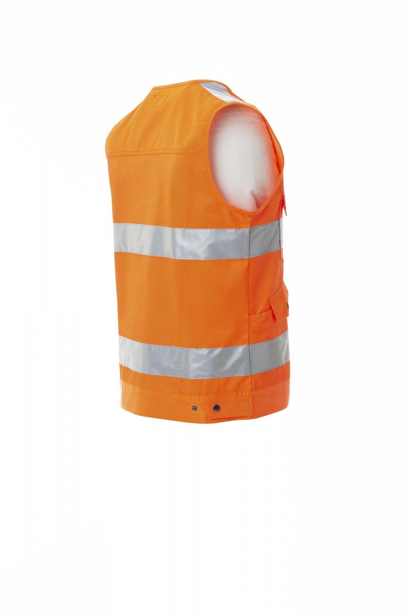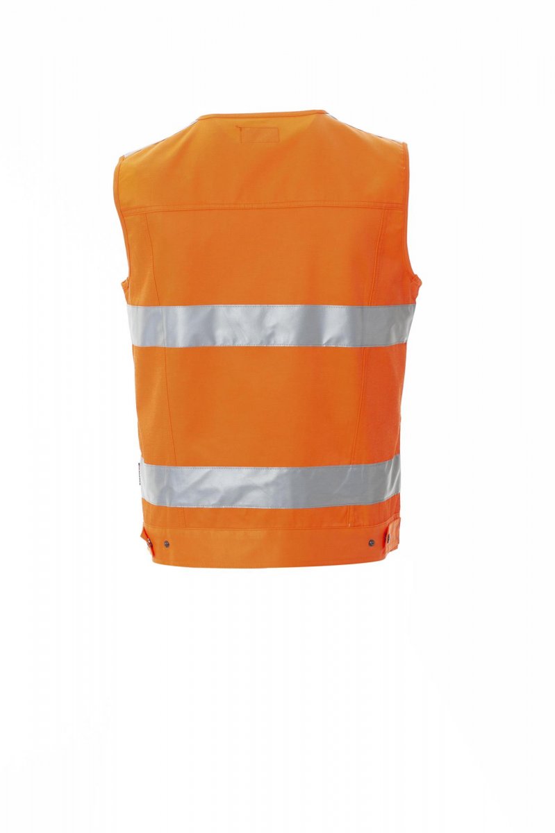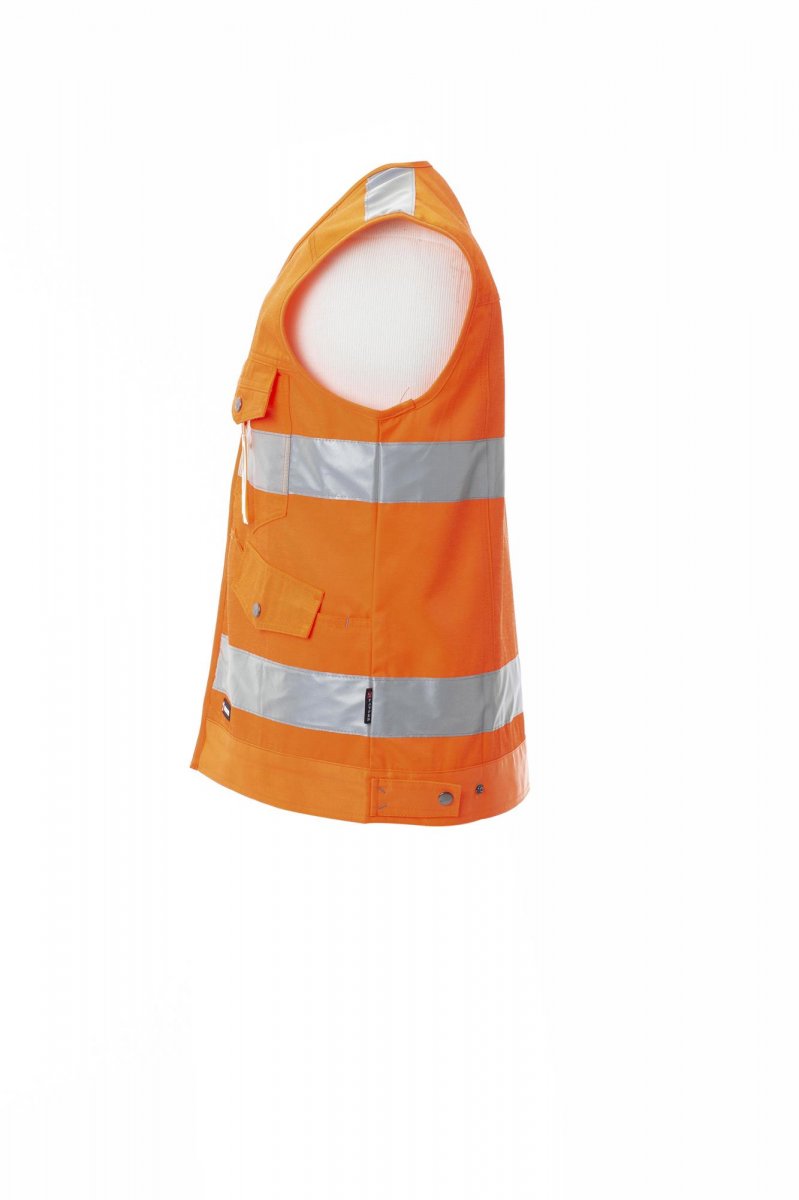 Bodywarmer met hoge zichtbaarheid met 3M strepen, voorsluiting met afgedekte rits, verstelbare tailleband met knopen, twee kangoeroezakken voor met LOCK SYSTEM en met metalen knoop, twee multifunctionele borstzakken, afneembare, uitvouwbare badgehouder. Nauwsluitend model in jeansstijl.