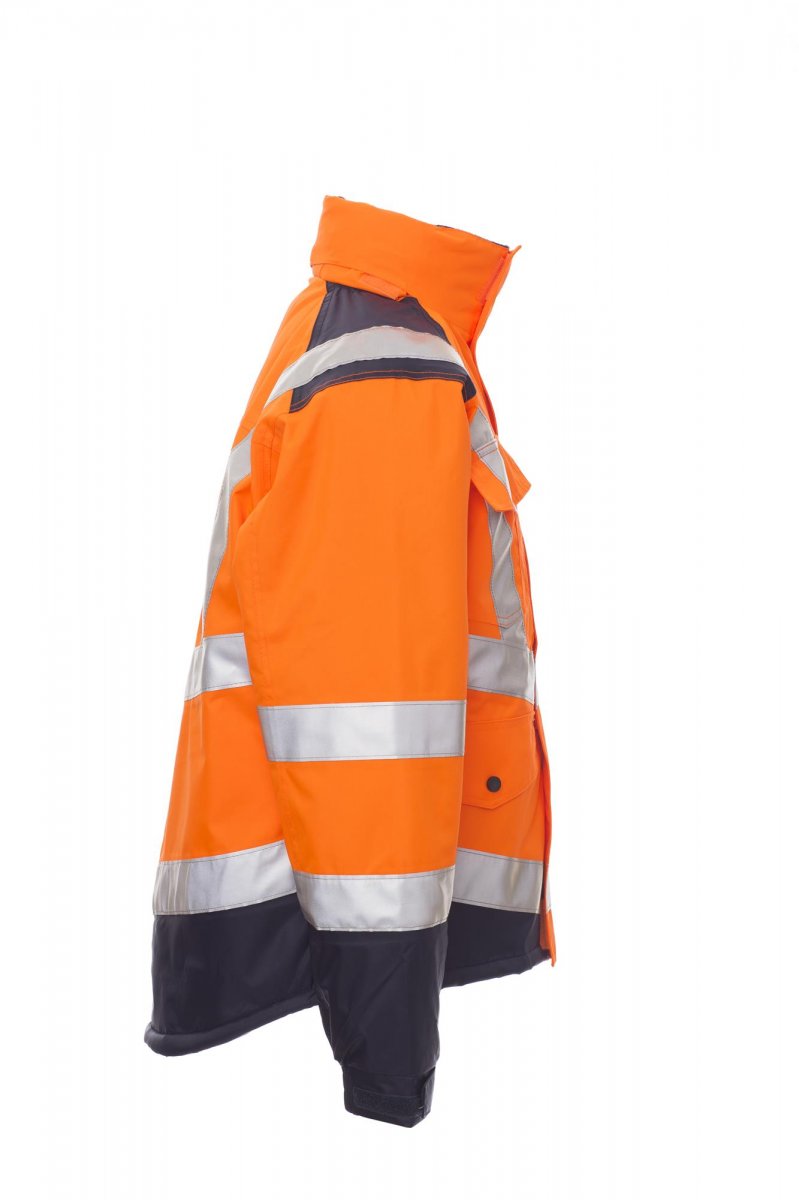 Tweekleurige jas met hoge zichtbaarheid, met reflecterende strepen, opening met afgedekte rits van kunststof, met metalen runner met overslag en klittenband, voorgevormde capuchon met trekkoord en/of invouwbaar in de kraag, verstelbare manchetten. 4 zakken vooraan met klep: borstzak rechts met klittenband, uitklapbare penhouder en badgehouder, borstzak met afgedekte ritssluiting, 2 onderaan met opening bovenaan, met rits en drukknoop en opening aan de zijkant. Niet-afneembare gewatteerde binnenkant, met kraag en schouders van microfleece, rits aan de onderkant achteraan om bedrukken en borduren te vereenvoudigen, met twee strepen rond de borstkas, de schouders en de mouwen. Gesealde naden.