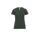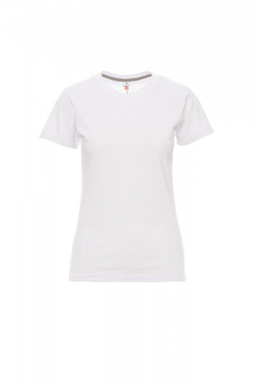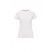 Nauwsluitend dames-T-shirt met korte mouwen en ronde hals, met afgezette geribde halsrand van 1,5 cm van een mix met spandex met stiksel aan de buitenkant, contrasterende versterkingsband van schouder naar schouder zichtbaar aan de binnenkant van de nek, elastische naden, zijnaden.