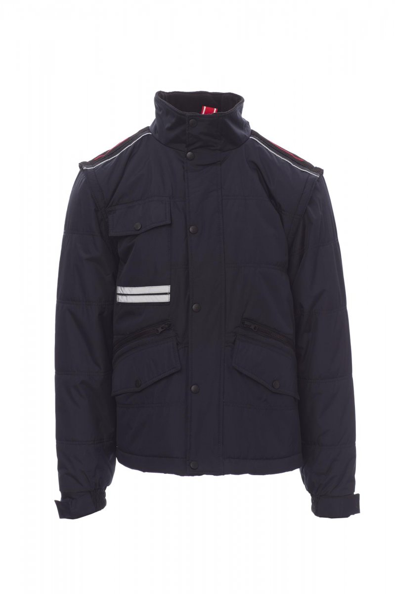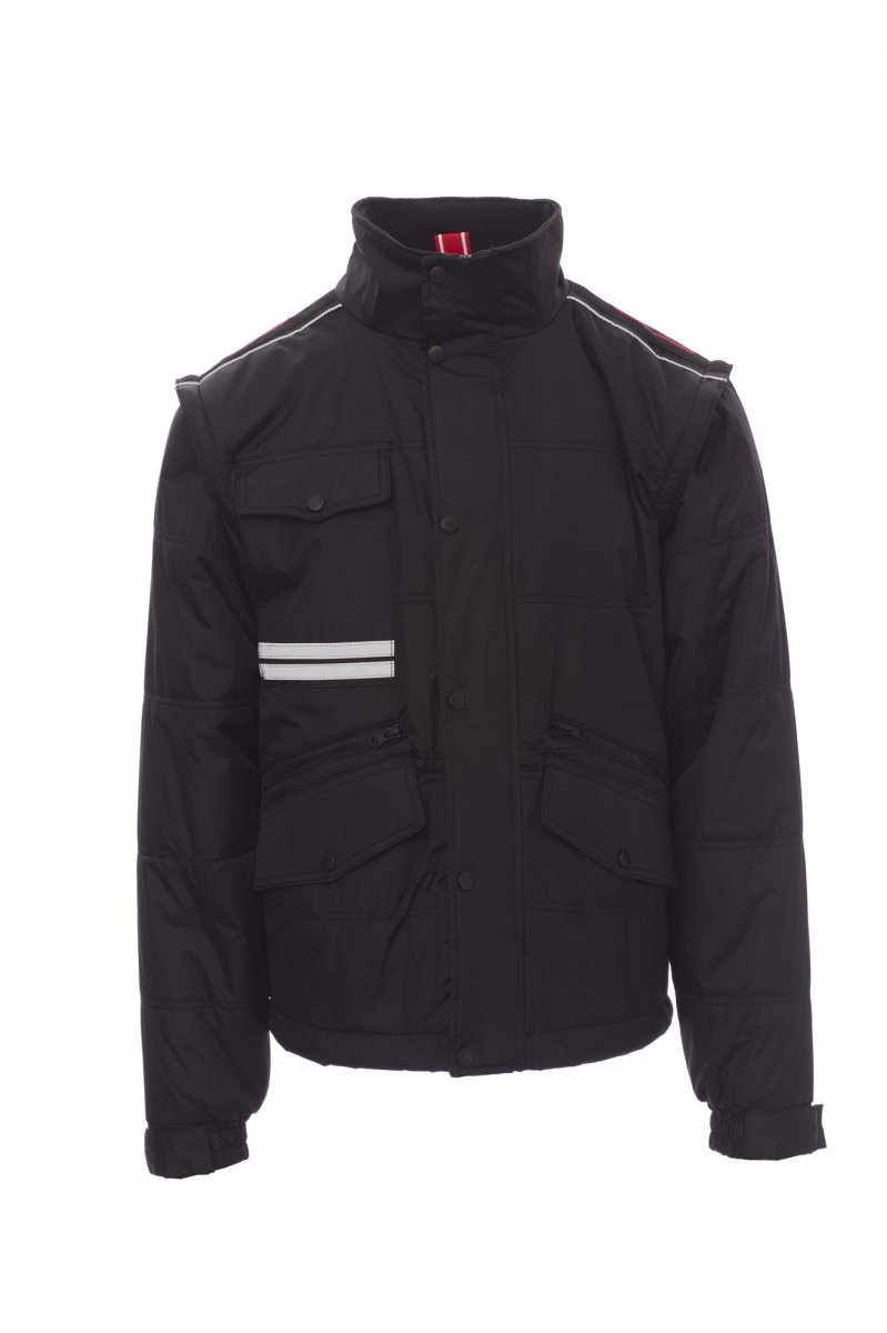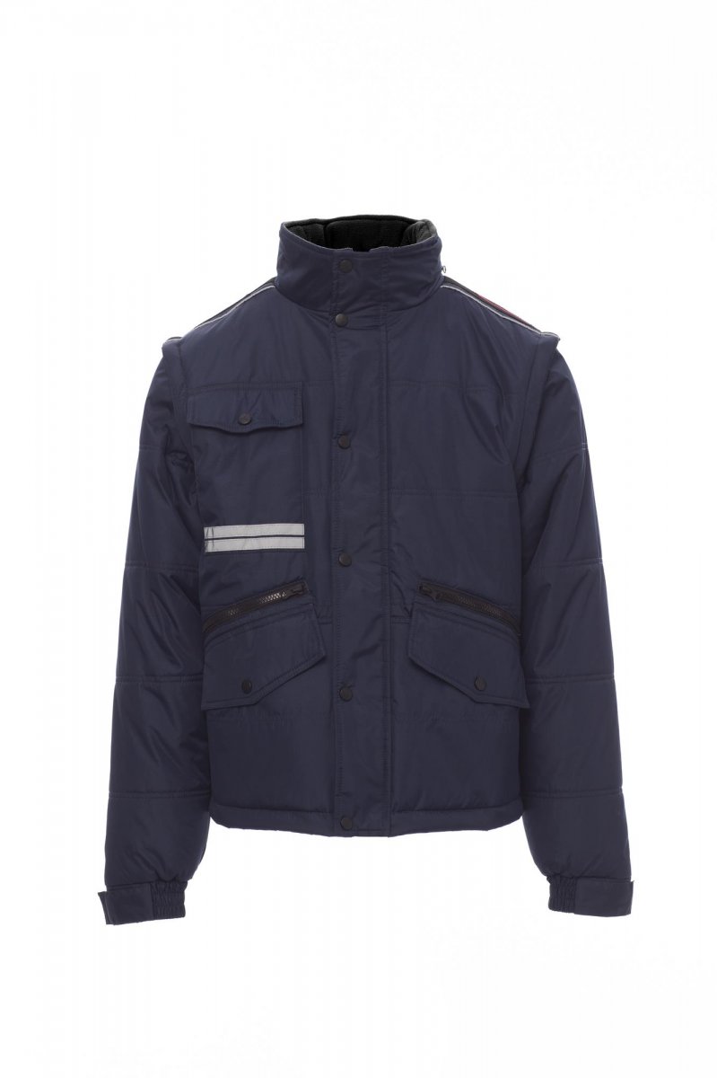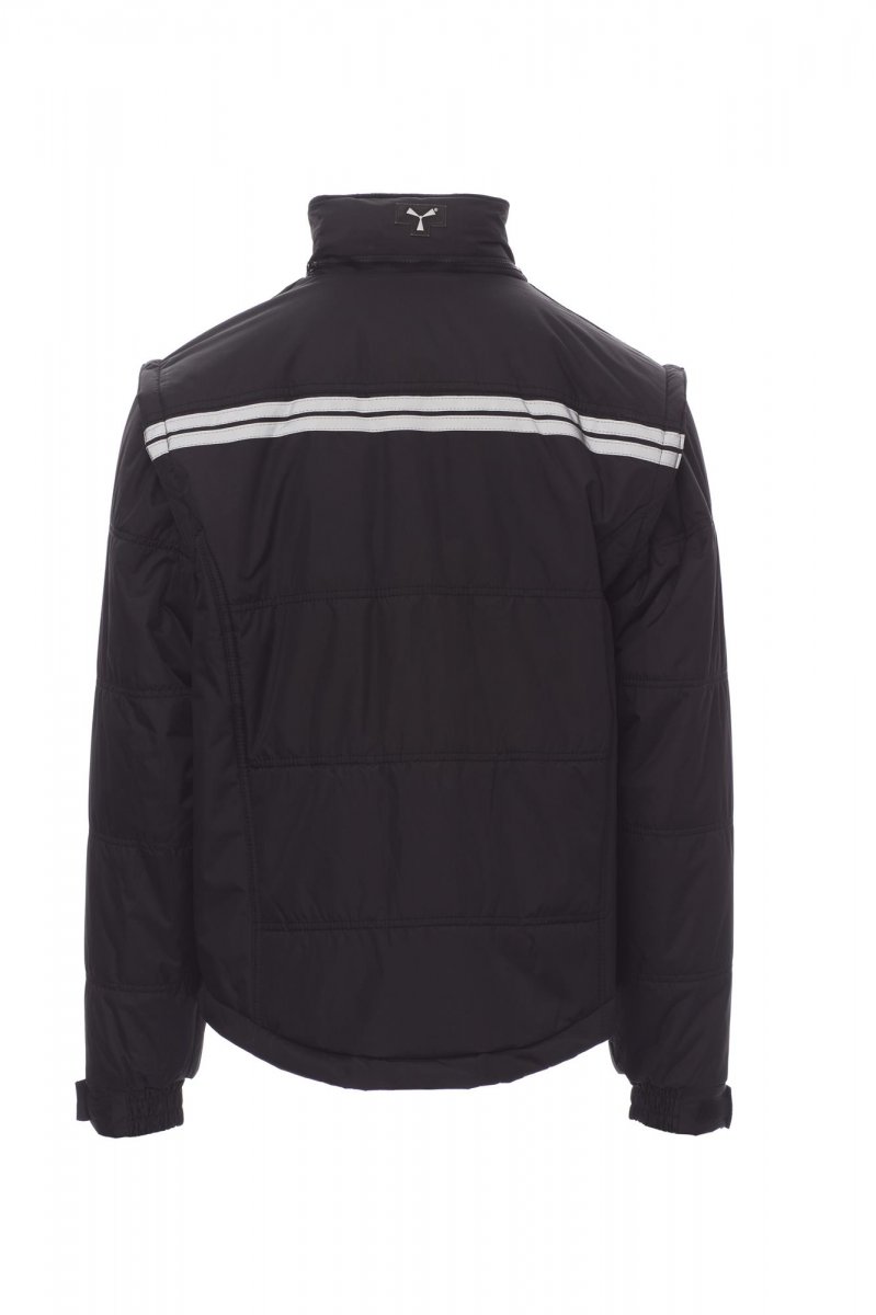 Herenjas, afneembare mouwen, kunststof rits van 8 mm met metalen runner met overslag en kunststof knopen, gevormde rug, uitvouwbare capuchon, twee buitenzakken met LOCK SYSTEM en twee met rits, schuine zakken voor gemakkelijker toegang, een borstzak voor smartphone en ring voor badgehouder, reflecterende banden op de zak en de rug. Binnenzijde: gewatteerd, contrasterende voering van fleece bij de rug en kraag, een binnenzak, rits aan binnenzijde om bedrukken en borduren te vereenvoudigen.
