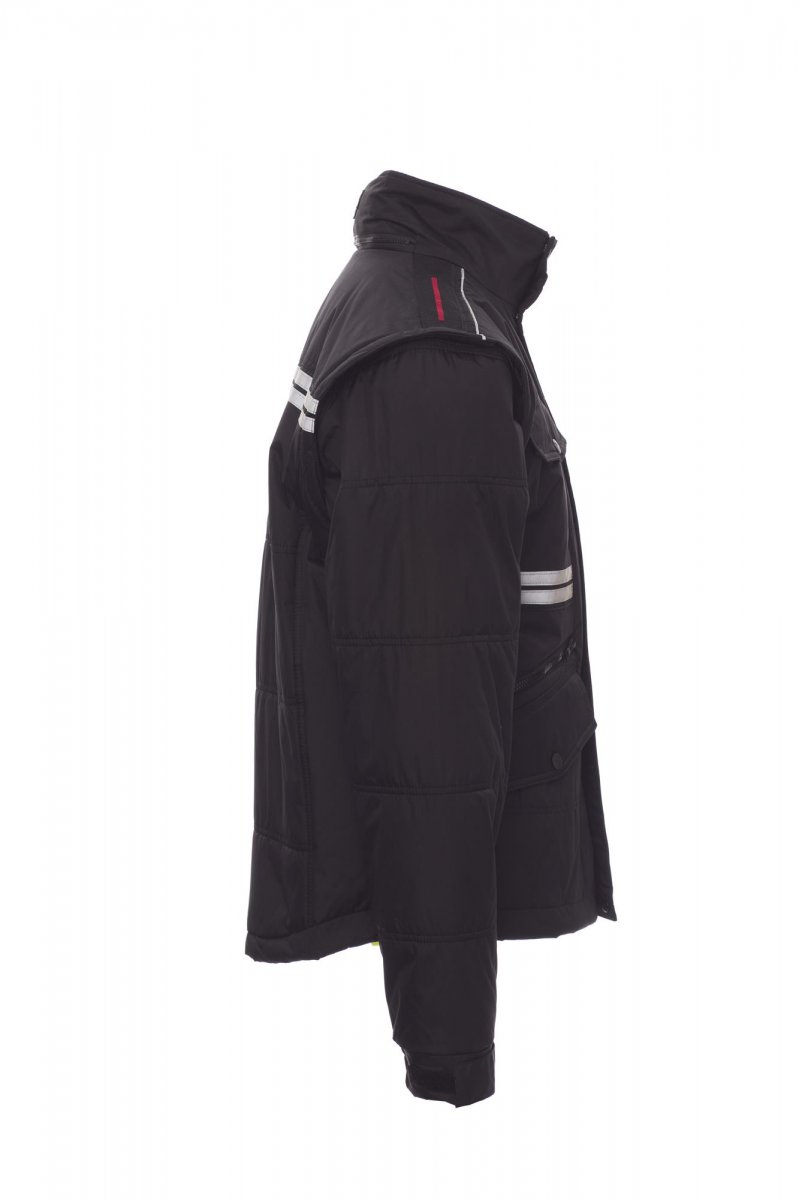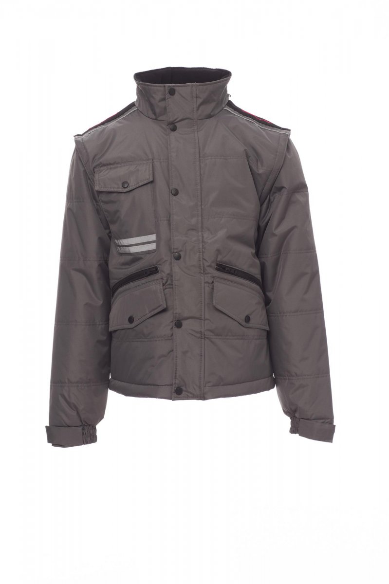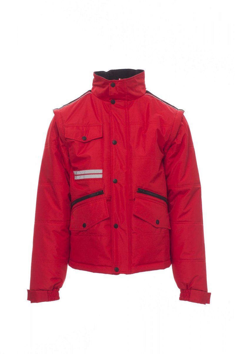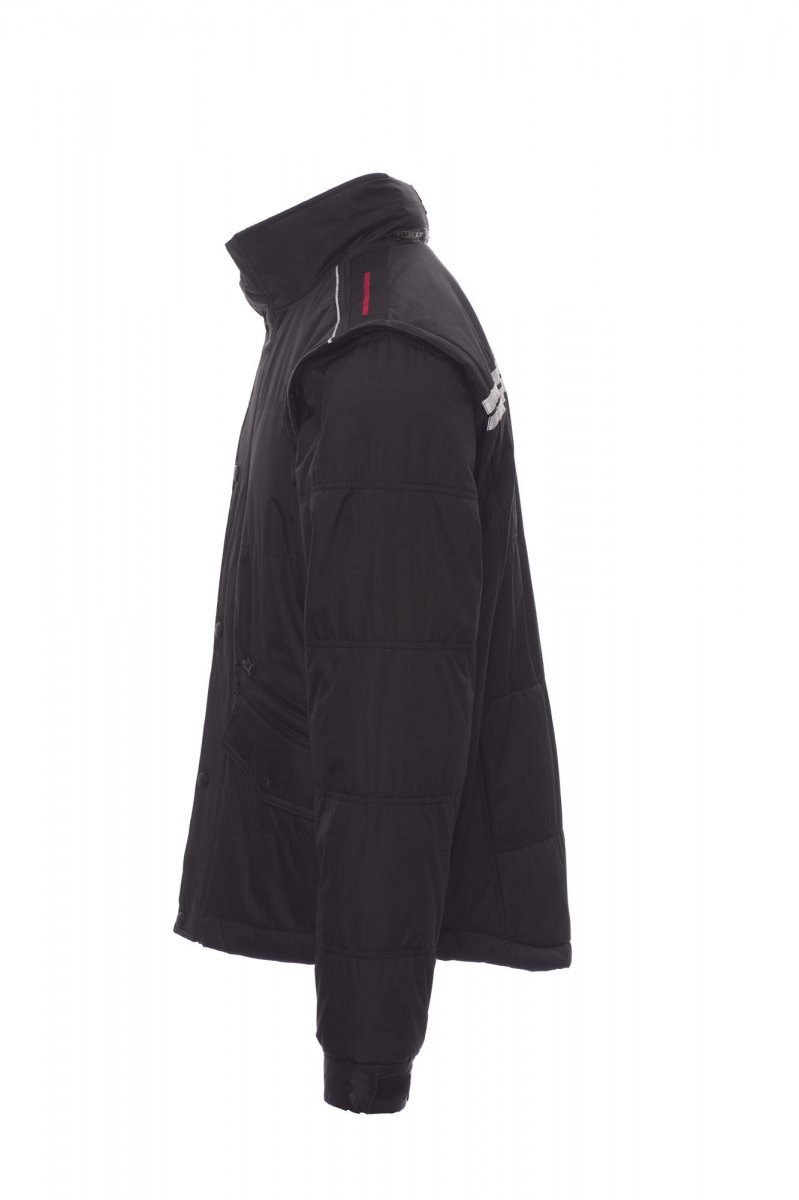 Herenjas, afneembare mouwen, kunststof rits van 8 mm met metalen runner met overslag en kunststof knopen, gevormde rug, uitvouwbare capuchon, twee buitenzakken met LOCK SYSTEM en twee met rits, schuine zakken voor gemakkelijker toegang, een borstzak voor smartphone en ring voor badgehouder, reflecterende banden op de zak en de rug. Binnenzijde: gewatteerd, contrasterende voering van fleece bij de rug en kraag, een binnenzak, rits aan binnenzijde om bedrukken en borduren te vereenvoudigen.