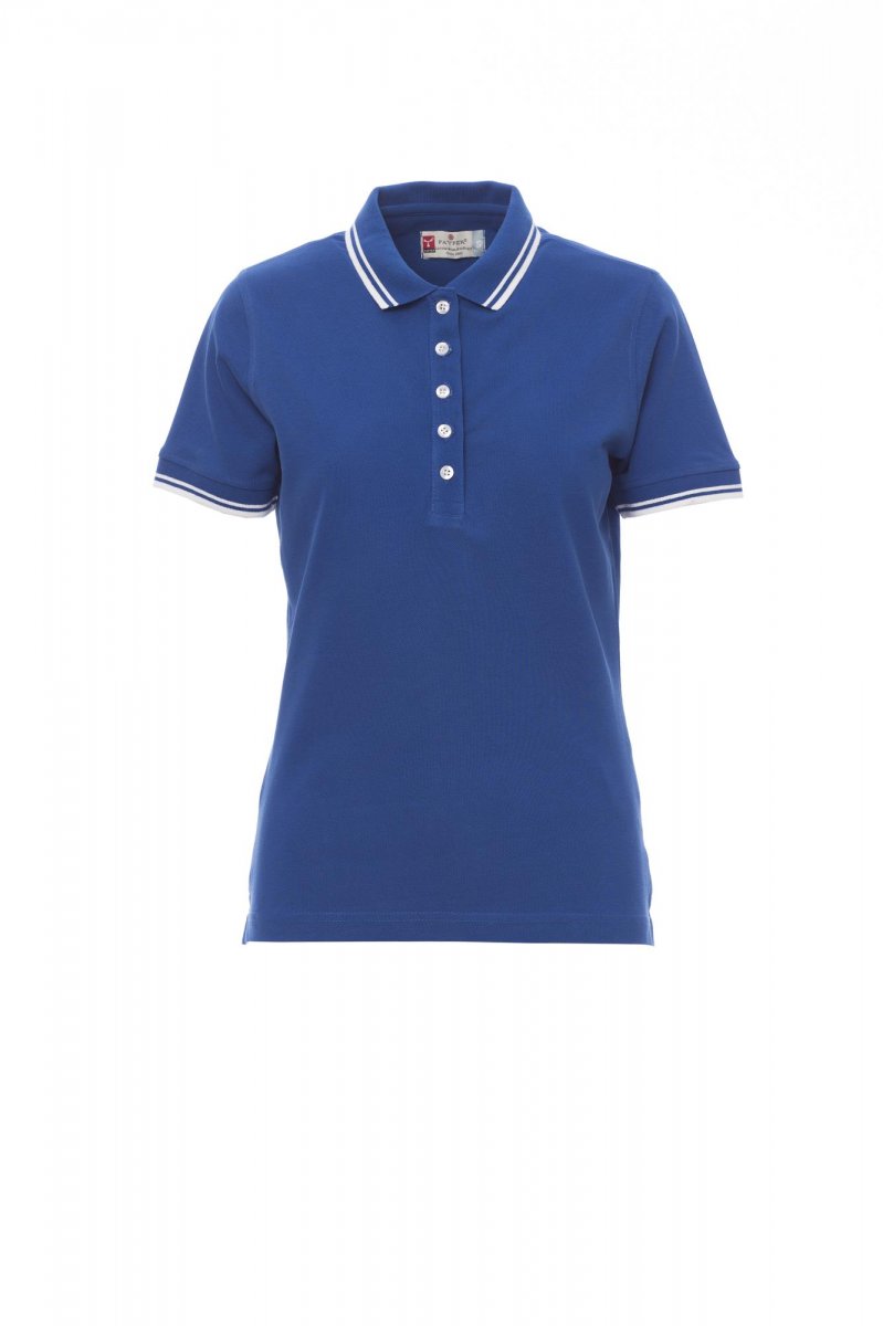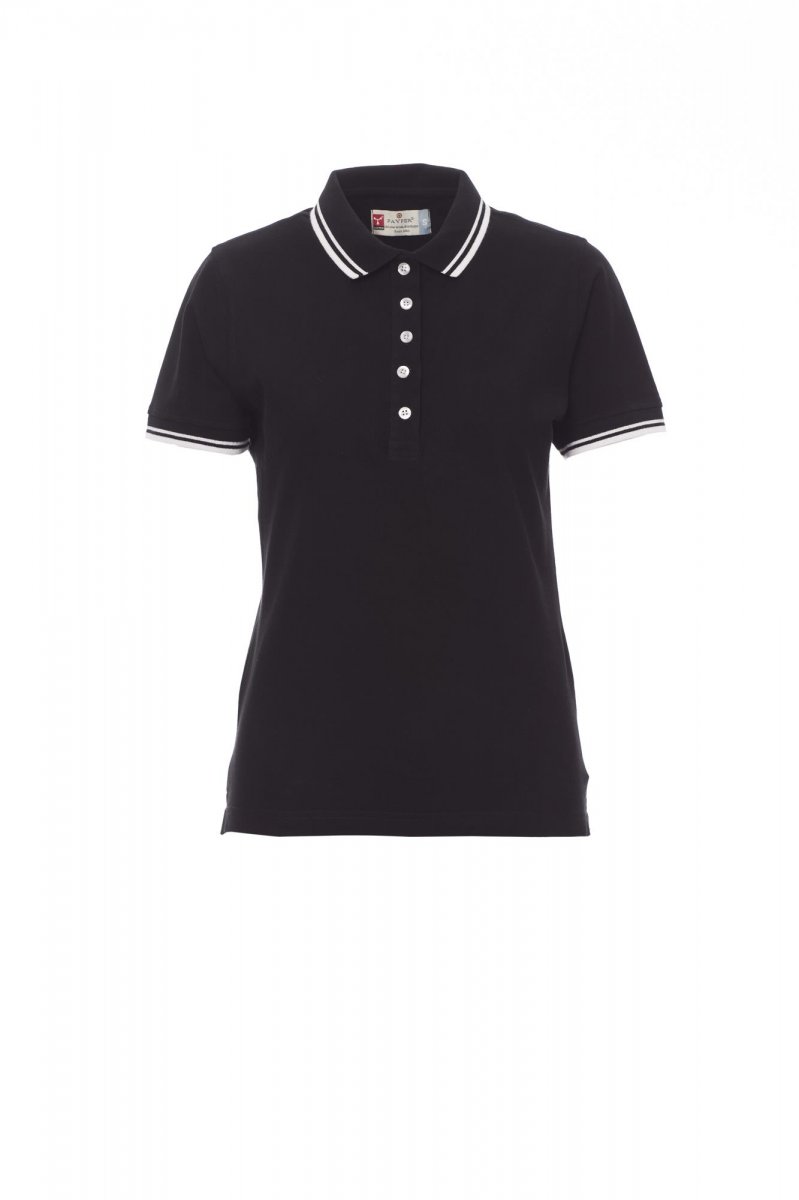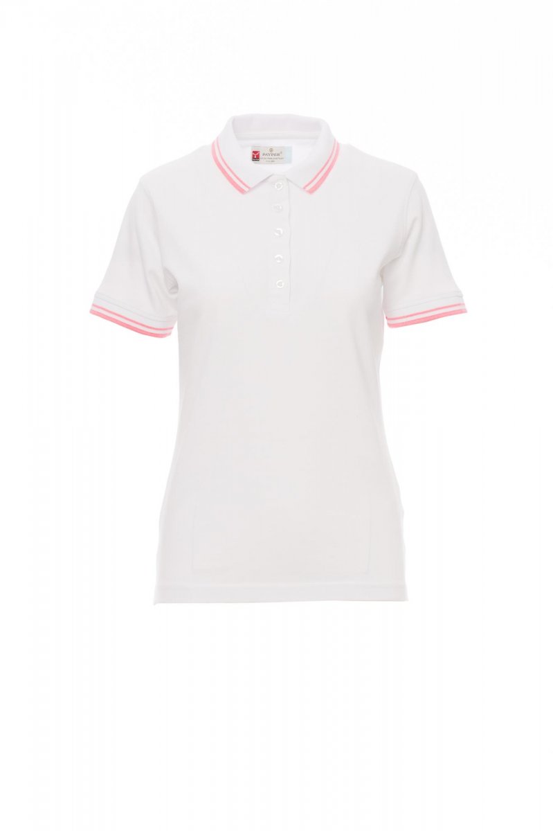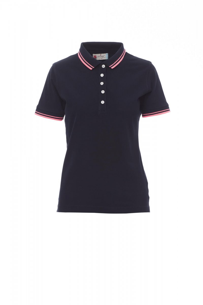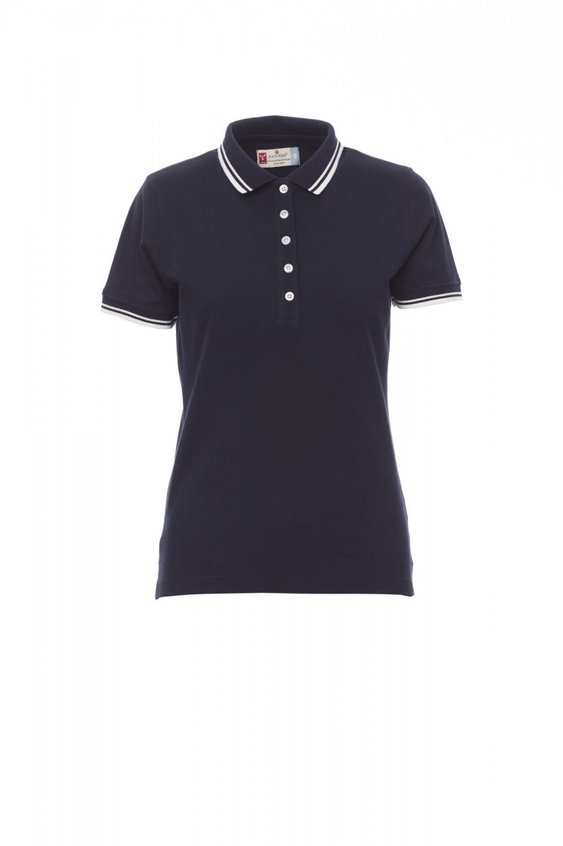 Nauwsluitend damespoloshirt met korte mouwen met 5 witte knopen, kraag en mouwen met fijne contrasterende strepen, ribkraag en geribde mouwrand, zijsplitten met versterkte naden, verborgen stiksels bij de kraag, versterkingsband aan de zijkant, elastische naden, band aan de binnenkant van de nek