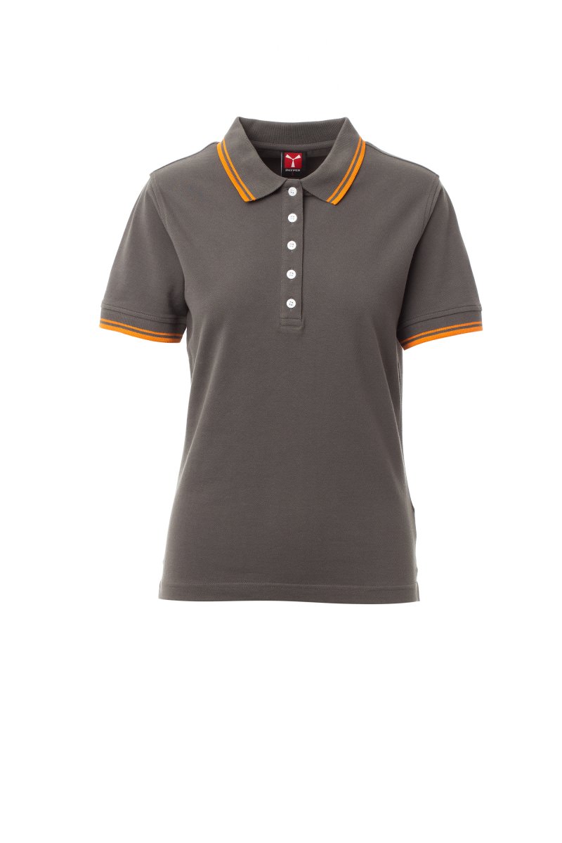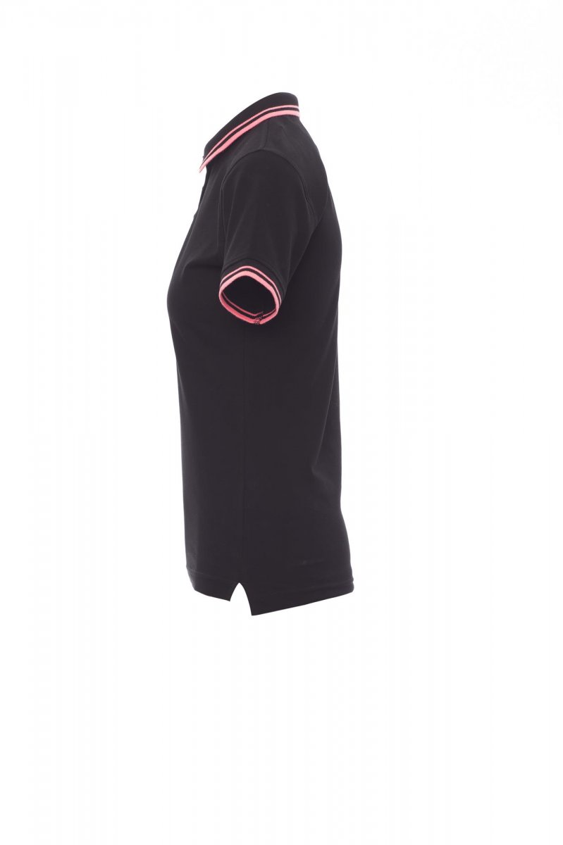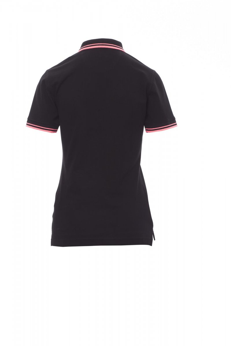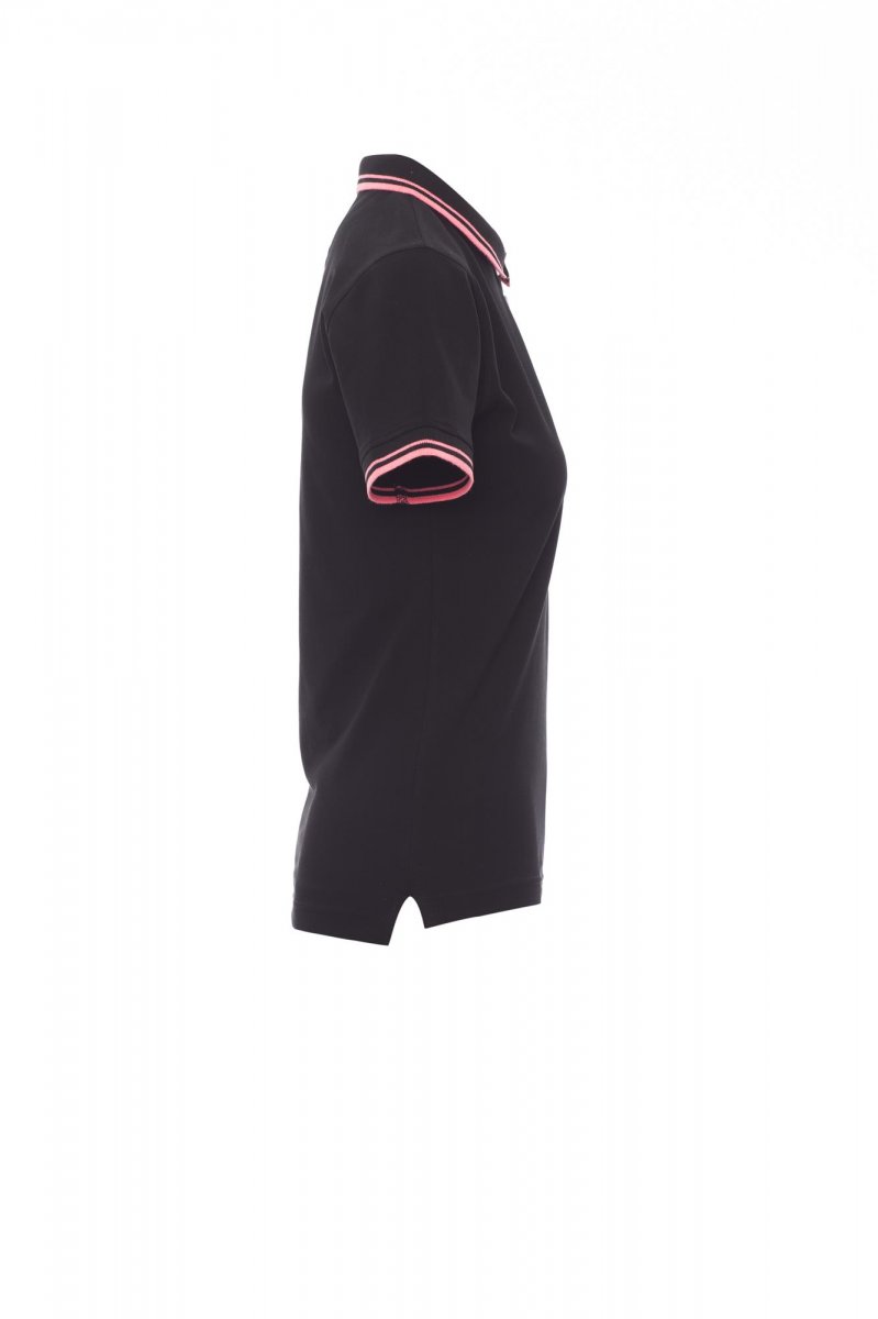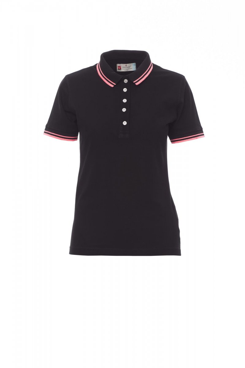 Nauwsluitend damespoloshirt met korte mouwen met 5 witte knopen, kraag en mouwen met fijne contrasterende strepen, ribkraag en geribde mouwrand, zijsplitten met versterkte naden, verborgen stiksels bij de kraag, versterkingsband aan de zijkant, elastische naden, band aan de binnenkant van de nek
