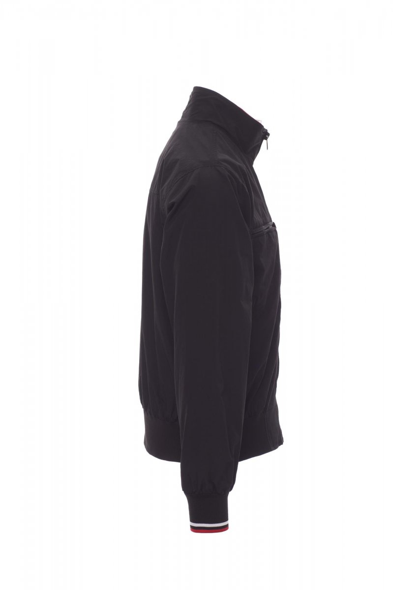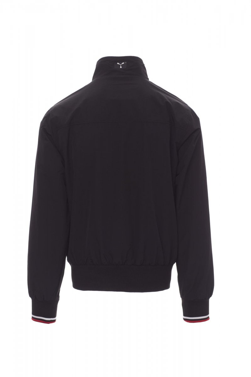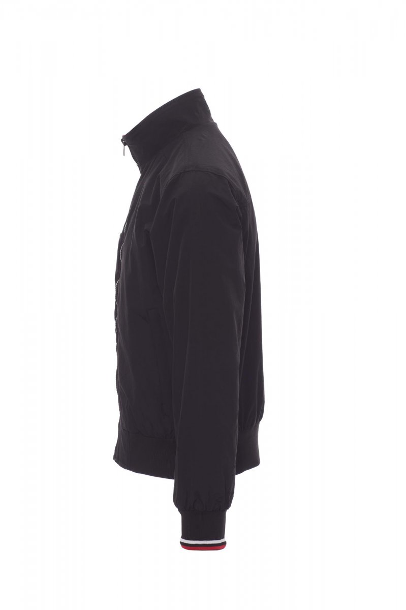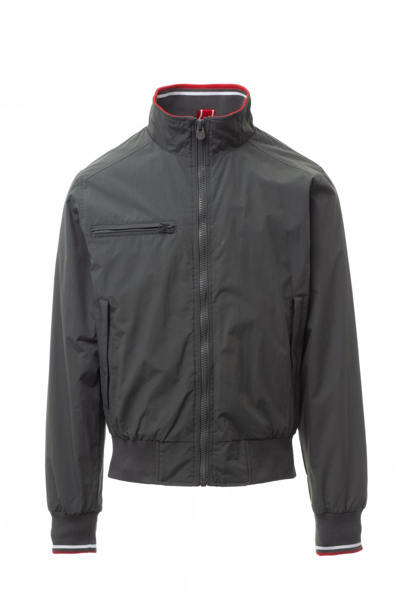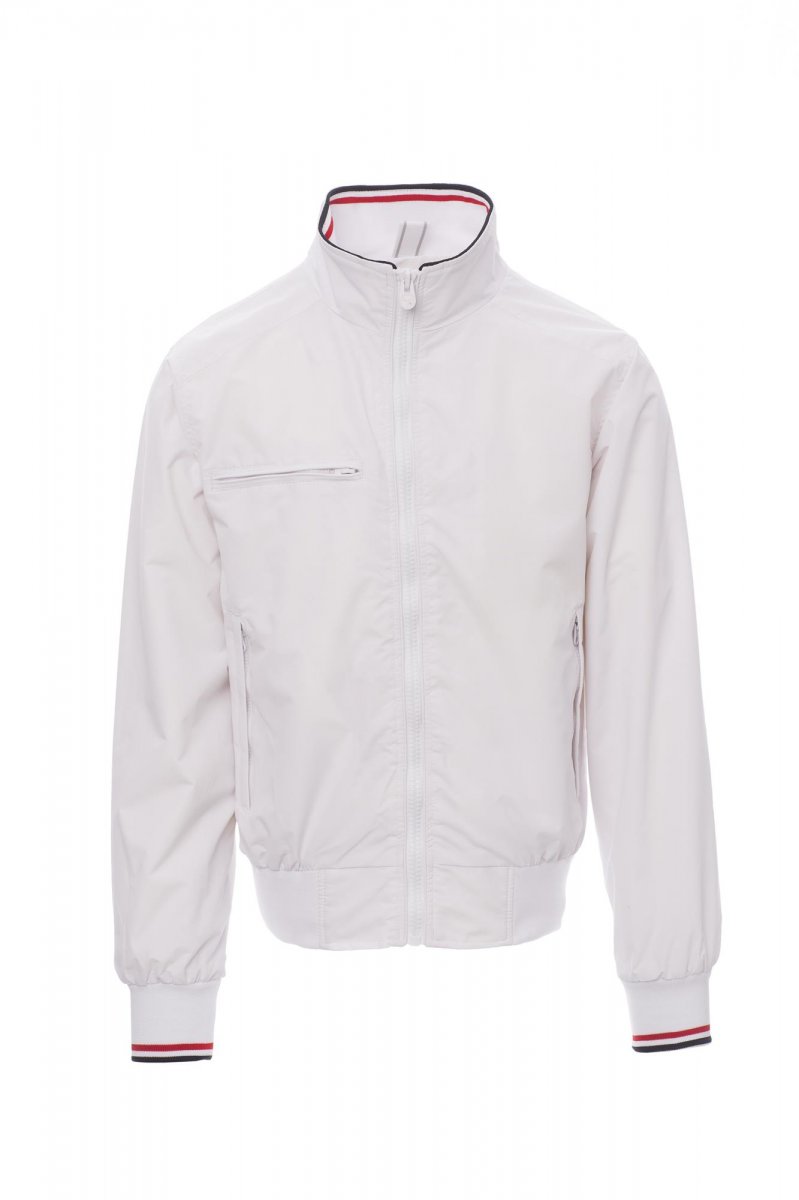 Herenjas, kunststof rits van 8 mm met metalen runner, elastische ribboord met strepen aan de hals, manchetten en taille, twee buitenzakken met kunststof rits. Binnenzijde niet gewatteerd, netvoering, een zak met rits voor smartphone met opening voor snoer, rits op de borst en de rug om bedrukken en borduren te vereenvoudigen.