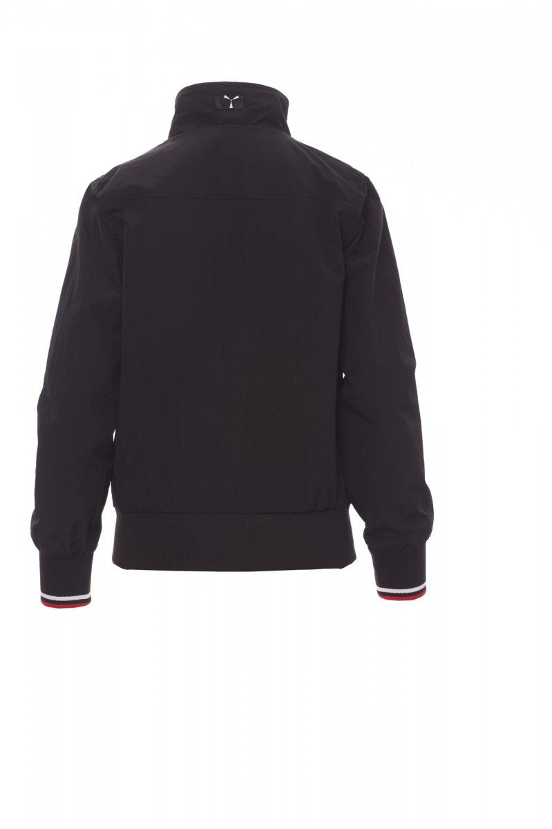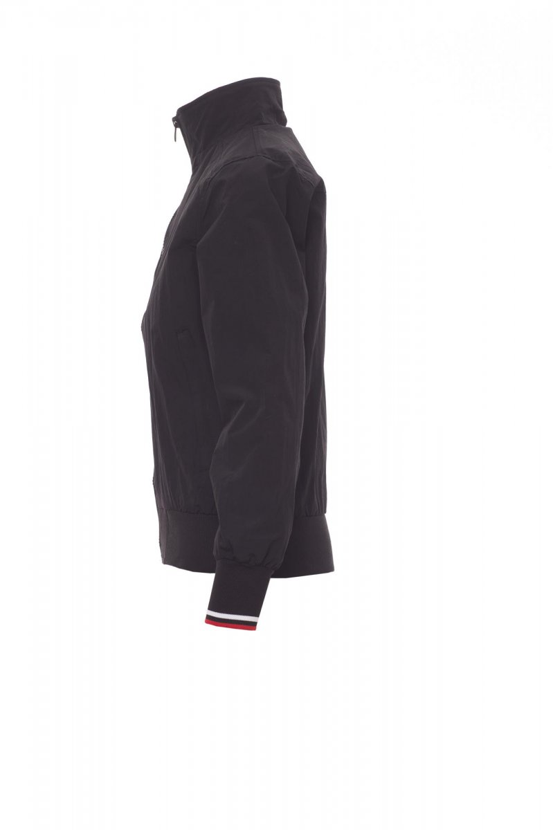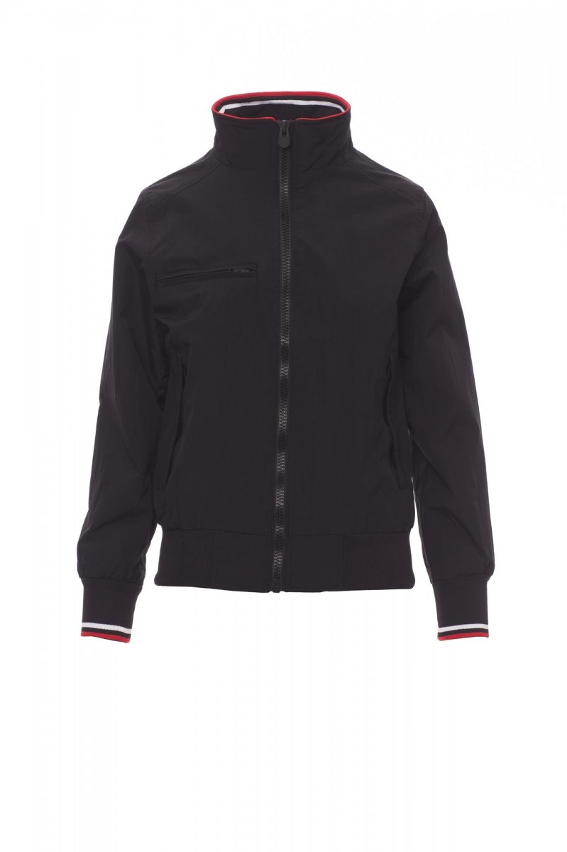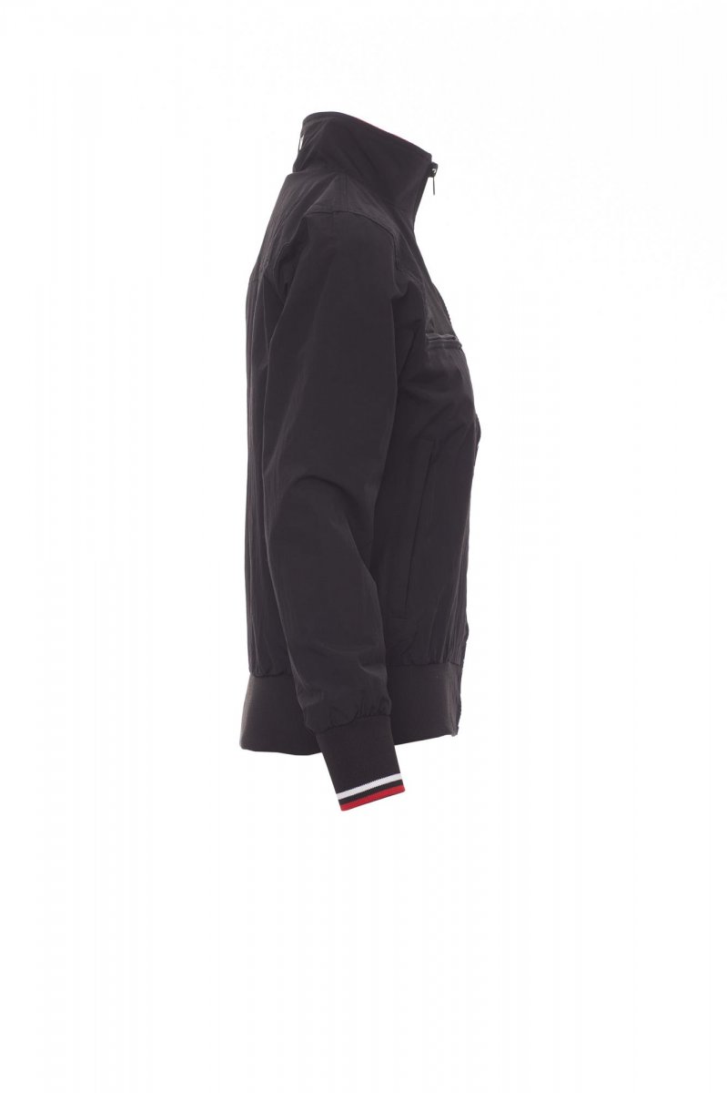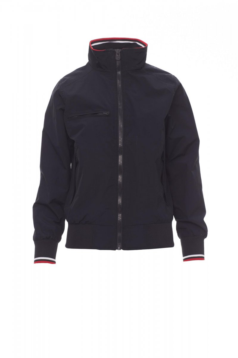 Damesjas comfort-fit, kunststof rits van 8 mm met metalen runner, elastische ribboord met strepen aan de hals, manchetten en taille, twee buitenzakken met kunststof rits. Binnenzijde niet gewatteerd, netvoering, een zak met rits voor smartphone met opening voor snoer, rits op de borst en de rug om bedrukken en borduren te vereenvoudigen.