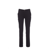 All-season damesstretchbroek met klassieke snit, elastische zijbanden en riemlussen in de taille, sluiting met rits en metalen knoop, twee voorzakken met klassieke snit, twee zijzakken met overslag en drukknopen, een zak met rits links, een verborgen duimstokzak rechts, twee ingezette achterzakken met knoopsgat en knoop.