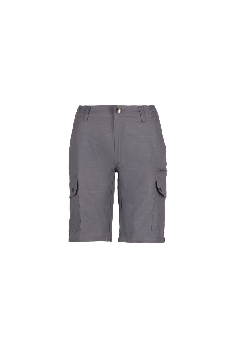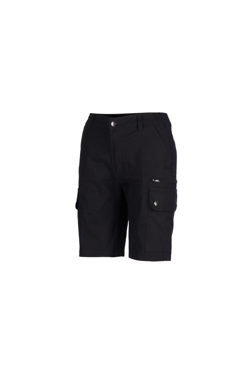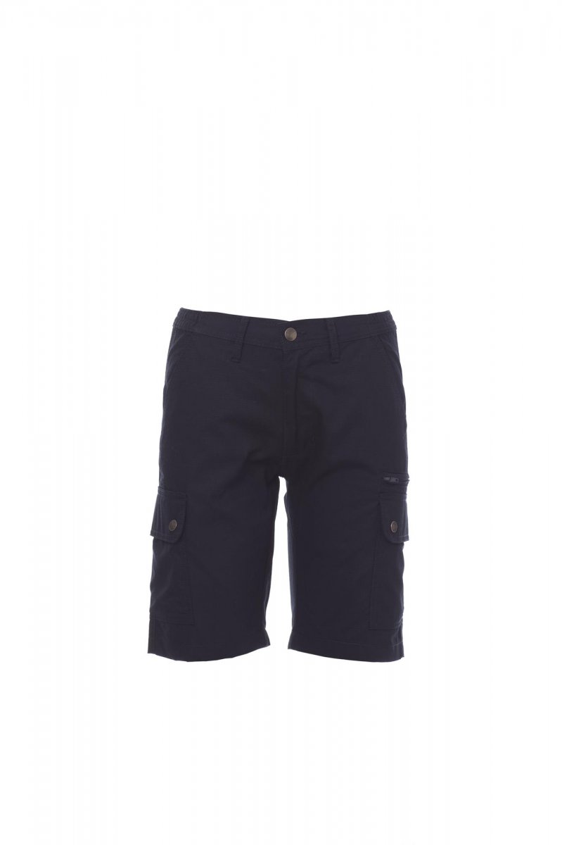 Damesbermuda, elastische zijbanden en riemlussen in de taille, sluiting met rits en metalen knoop, twee voorzakken met klassieke snit, twee zijzakken met overslag en drukknopen, een zak met rits links, een verborgen duimstokzak rechts, twee ingezette achterzakken met knoopsgat en knoop.