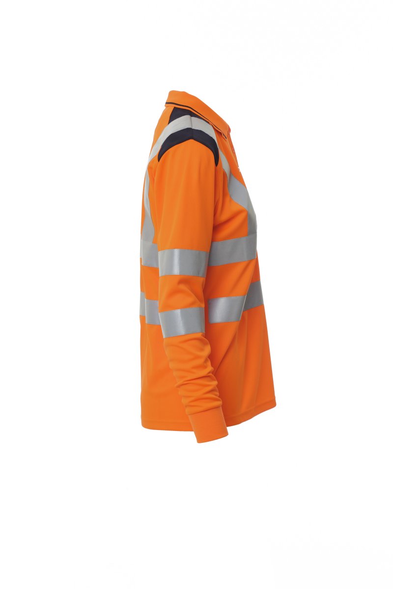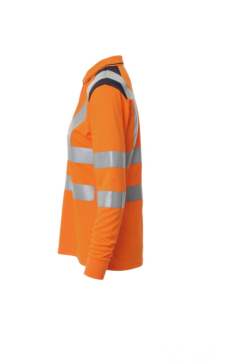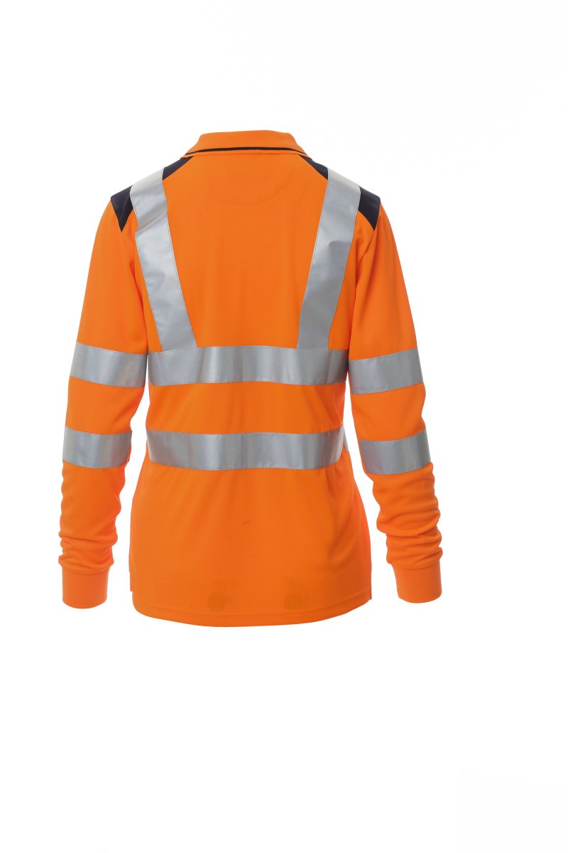 Damespoloshirt met hoge zichtbaarheid, met lange mouwen, in twee kleuren, met reflecterende strepen, met vier bijpassende knopen met parelmoereffect, contrasterende fijne ribkraag en mouwrand, zijsplitten, verborgen stiksel bij de kraag.