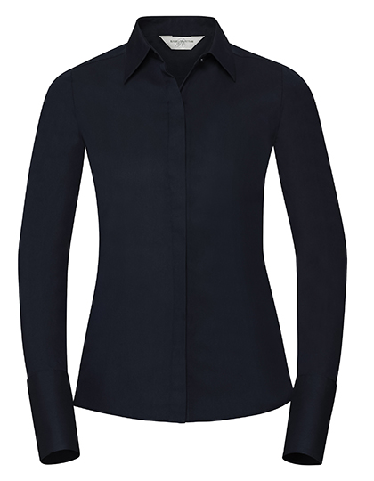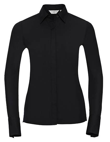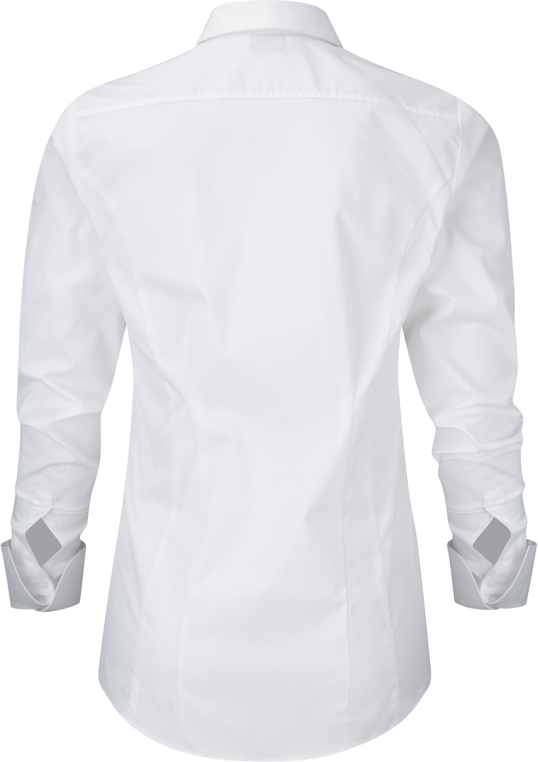 Shirt LSL. 75% katoen-25% Lycra® (T400® fibre). Gewicht: wit 125 g/m², zwart 130 g/m². Stretch. Uitstekende vormvastheid, duurzame stof, vochtregulerend, dit houdt de drager droog en koel. Moderne kraag. Verborgen knoopsluiting. Princess panel seams, geen zijnaden. cocktail manchetten. Ronde zoom.